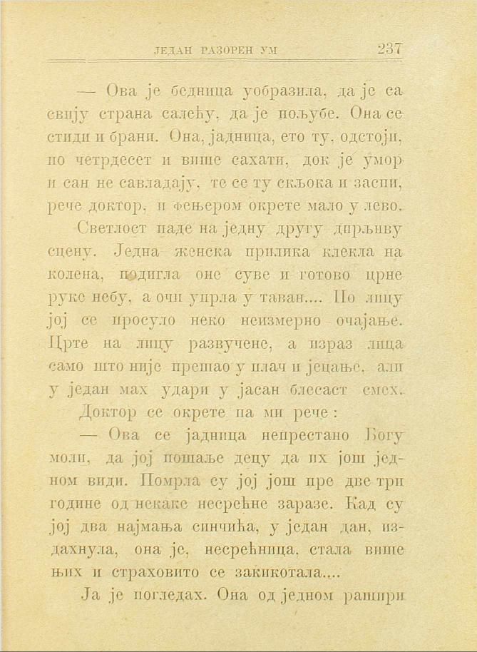 Светлост паде на једну другу дирљиву сцену. Једна женска прилика клекла на колена, подигла оне суве и готово црне руке небу, а очи упрла у таван.... По лицу јој се просуто неко неизмерно очајање. Црте на лицу развучене, а израз лица само што није прешао у плач и јецање, али у један мах удари у јасан блесаст смех.