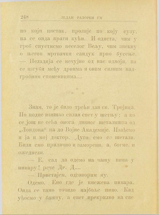Знам, то је било трећи дан св. Тројица. По подне изишао силан свет у шетњу: а ко се још не сећа онога дивног шеталишта од „Лондона“ па до Војне Академије. Изађемо и ја и мој доктор. Дуго смо се шетали. Били смо прилично и заморени, а, богме, и ожеднели.