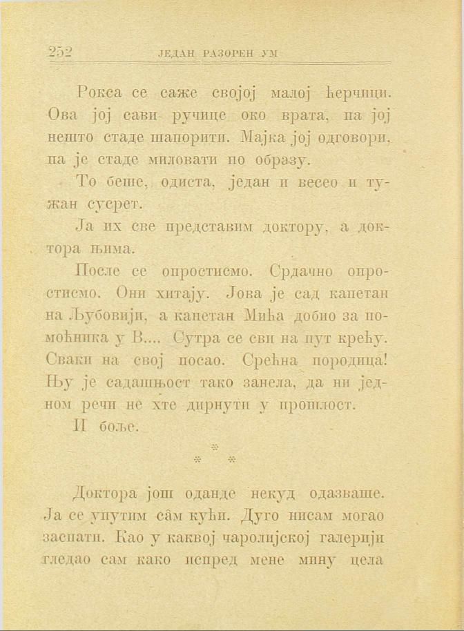 После се опростисмо. Срдачно опростисмо. Они хитају. Јова је сад капетан на Љубовији, а капетан Мића добио за помоћника у В.... Сутра се сви на пут крећу. Сваки на свој посао. Срећна породица! Њу је садашњост тако занела, да ни једном речи не хте дирнути у прошлост.