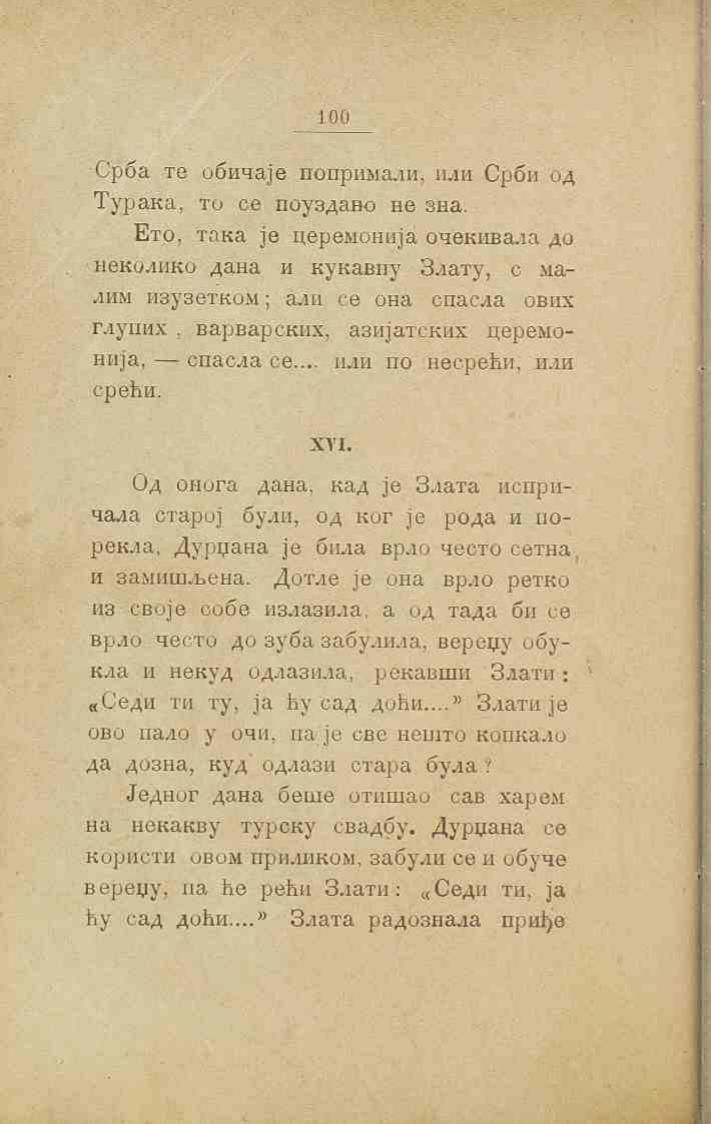 Ето, така је церемонија очекивала до неколико дана и кукавну Злату, с малим изузетком; али се она спасла ових глупих, варварских, азијатских церемонија, — спасла се.... или по несрећи, или срећи.