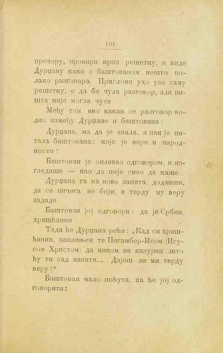 Тада ће Дурџана рећи: „Кад си хришћанин, заклињем те Пегамбер-Исом (Исусом Христом) да ником не казујеш што ћу ти сад казати.... Дајеш ли ми тврду веру?“