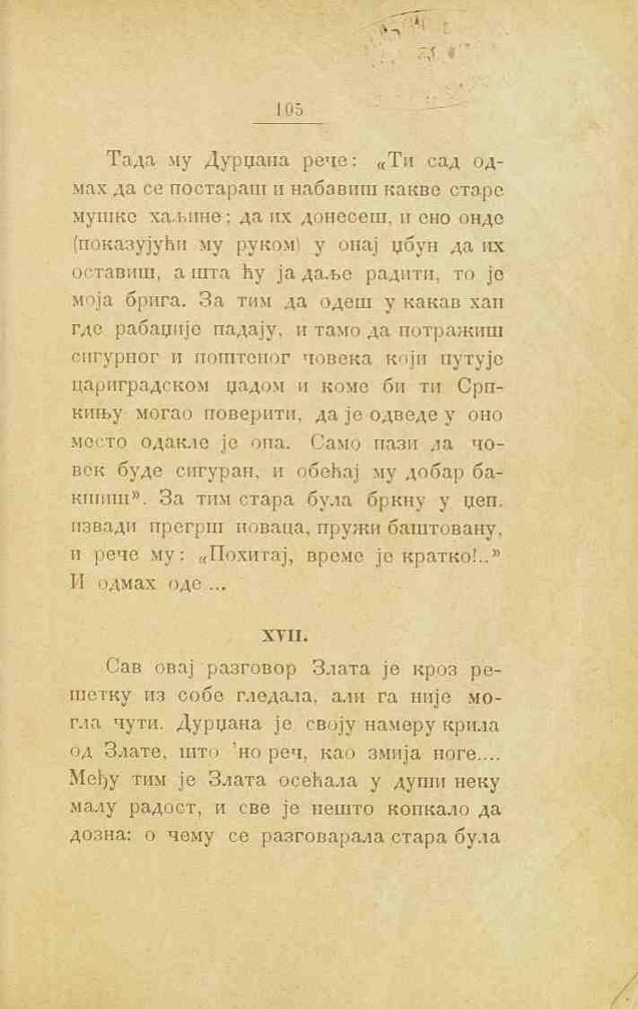 Тада му Дурџана рече: „Ти сад одмах да се постараш и набавиш какве старе мушке хаљине; да их донесеш, и ено онде (показујући му руком) у онај џбун да их оставиш, а шта ћу ја даље радити, то је моја брига. За тим да одеш у какав хан где рабаџије падају, и тамо да потражиш сигурног и поштеног човека који путује цариградском џадом и коме би ти Српкињу могао поверити, да је одведе у оно место одакле је она. Само пази да човек буде сигуран, и обећај му добар бакшиш“. За тим стара була бркну у џеп, извади прегрш новаца, пружи баштовану, и рече му: „Похитај, време је кратко!..“ И одмах оде...