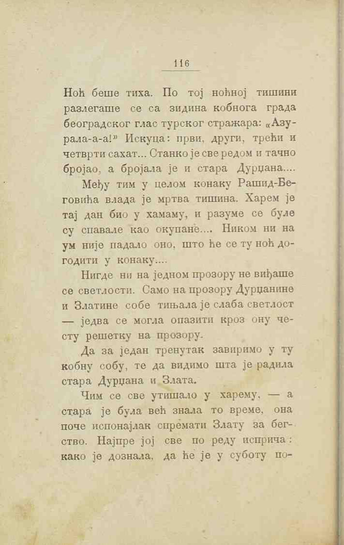 Чим се све утишало у харему, — а стара је була већ знала то време, она поче испонајлак спремати Злату за бегство. Најпре јој све по реду исприча: како је дознала, да ће је у суботу потурчити,