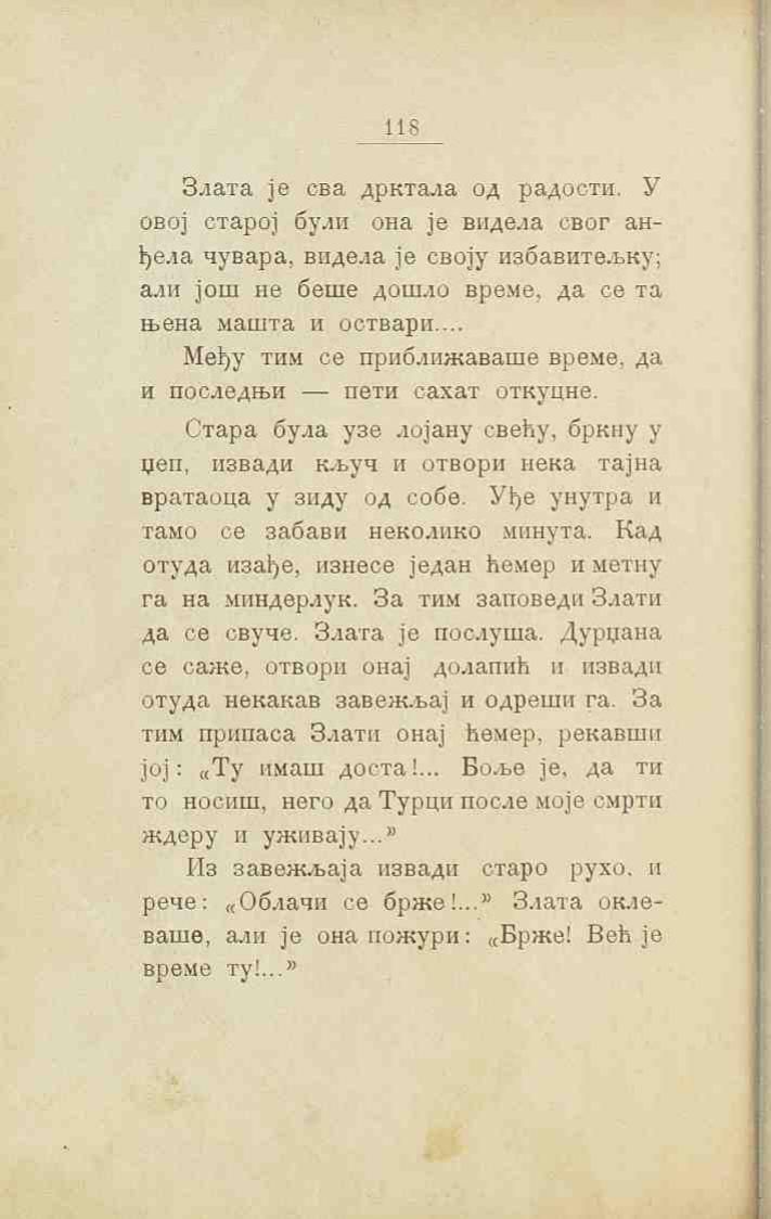 Стара була узе лојану свећу, бркну у џеп, извади кључ и отвори нека тајна вратаоца у зиду од собе. Уђе унутра и тамо се забави неколико минута. Кад отуда изађе, изнесе један ћемер и метну га на миндерлук. За тим заповеди Злати да се свуче. Злата је послуша. Дурџана се саже, отвори онај долапић и извади отуда некакав завежљај и одреши га. За тим припаса Злати онај ћемер, рекавши јој: „Ту имаш доста!... Боље је, да ти то носиш, него да Турци после моје смрти ждеру и уживају...“