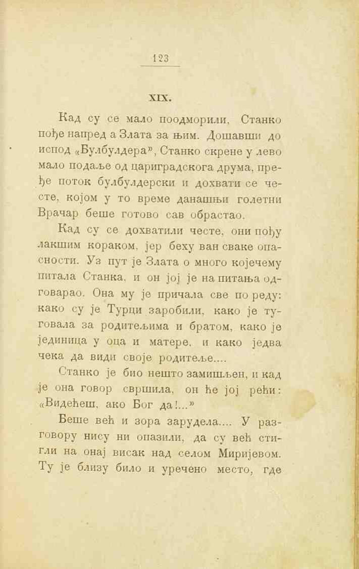 Кад су се мало поодморили, Станко пође напред а Злата за њим. Дошавши до испод „Булбулдера“, Станко скрене у лево мало подаље од цариградскога друма, пређе поток булбулдерски и дохвати се честе, којом у то време данашњи голетни Врачар беше готово сав обрастао.