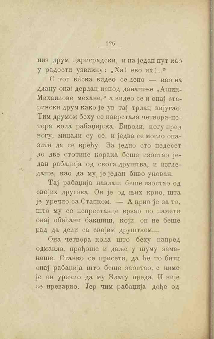С тог виска видео се лепо — као на длану онај дерлац испод данашње „Ашик-Михаилове механе,“ а видео се и онај старински друм како је уз тај трлац вијугао. Тим друмом беху се наврстала четвора-петора кола рабаџијска. Биволи, ногу пред ногу, мицали су се, и једва се могло опазити да се крећу. За једно сто педесет до две стотине корака беше изостао један рабаџија од свога друштва, и изгледаше, као да му је један биво укован.