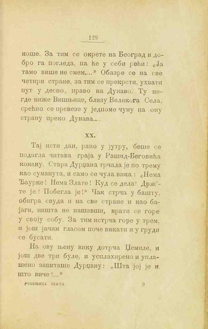 Тај исти дан, рано у јутру, беше се подигла читава граја у Рашид-Беговића конаку. Стара Дурџана трчала је по трему као суманута, и само се чула вика: „Нема Ђаурке! Нема Злате! Куд се дела? Држ’ те је? Побегла је!“ Чак стрча у башту, обигра свуда и на све стране и као бајаги, ништа не нашавши, врати се горе у своју собу. За тим истрча горе у трем, и још јачим гласом поче викати и у груди се бусати.