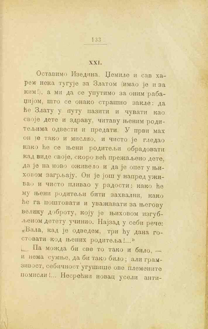 Оставимо Изедина, Џемиле и сав харем нека тугује за Златом (имао је и за ким!], а ми да се упутимо за оним рабаџијом, што се онако страшно закле: да ће Злату у путу пазити и чувати као своје дете и здраву, читаву њеним родитељима одвести и предати. У први мах он је тако и мислио, и чисто је гледао како ће се њени родитељи обрадовати кад виде своје, скоро већ прежаљено дете, да је на ново оживело и да је опет у њиховом загрљају. Он је још у напред уживао и чисто пливао у радости: како ће му њени родитељи бити захвални, како ће га поштовати и уважавати за његову велику доброту, коју је њиховом изгубљеном детету учинио. Најзад у себи рече: „Вала, кад је одведем, три ћу дана гостовати код њених родитеља!...“