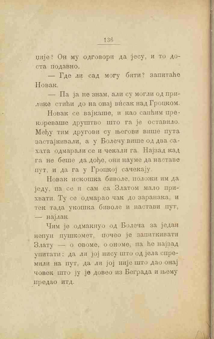 Чим је одмакнуо од Болеча за један непун пушкомет, почео је запиткивати Злату — о овоме, о ономе, па ће најзад упитати: да ли јој нису што од јела спремили на пут, да ли јој није што дао онај човек што ју је довео из Беграда и њему предао итд.