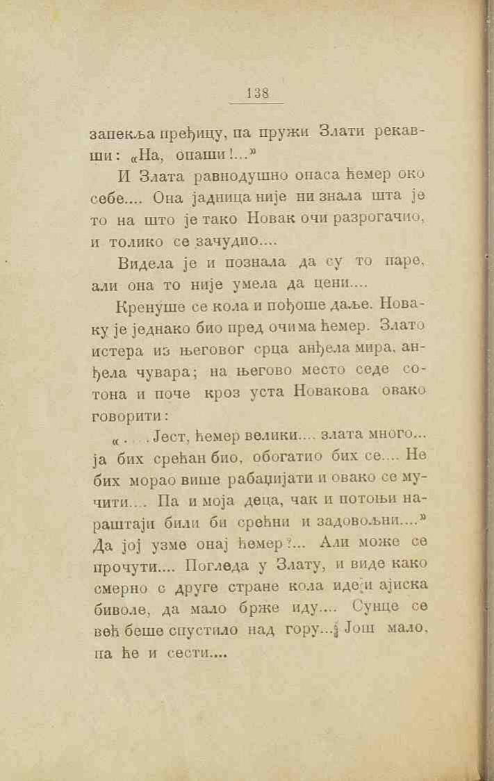 „... Јест, ћемер велики.... злата много... ја бих срећан био, обогатио бих се.... Не бих морао више рабаџијати и овако се мучити_ Па и моја деца, чак и потоњи нараштаји били би срећни и задовољни....“ Да јој узме онај ћемер?... Али може се прочути.... Погледа у Злату, и виде како смерно с друге стране кола иде и ајиска биволе, да мало брже иду.... Сунце се већ беше спустило над гору.... Још мало, па ће и сести....