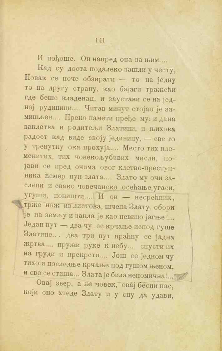 Кад су доста подалеко зашли у честу, Новак се поче обзирати — то на једну то на другу страну, као бајаги тражећи где беше кладенац, и заустави се на једној рудиници.... Читав минут стојао је замишљен.... Преко памети пређе му: и дана заклетва и родитељи Златини, и њихова радост кад виде своју јединицу, — све то у тренутку ока прохуја.... Место тих племенитих, тих човекољубивих мисли, појави се пред очима овог клетво-преступника ћемер пун злата.... Злато му очи заслепи и свако човечанско осећање угаси, угуши, поништи.... И он — несрећник, трже нож из листова, шчепа Злату, обори је на земљу и закла је као невино јагње!... Један пут — два чу се крчање испод гуше Златине... два три пут праћну се јадна жртва.... пружи руке к небу.... спусти их на груди и прекрсти.... Још се једном чу тихо и последње крчање под гушом њеном, и све се стиша... Злата је била непомична!...