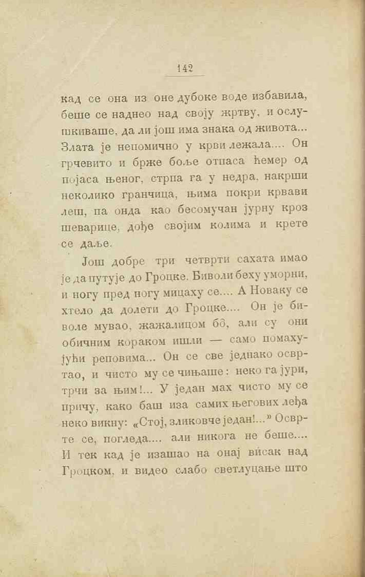 Још добре три четврти сахата имао је да путује до Гроцке. Биволи беху уморни, и ногу пред ногу мицаху се.... А Новаку се хтело да долети до Гроцке.... Он је биволе мувао, жажалицом бо, али су они обичним кораком ишли — само помахујући реповима... Он се све једнако освртао, и чисто му се чињаше: неко га јури, трчи за њим!... У један мах чисто му се причу, како баш иза самих његових леђа неко викну: „Стој, зликовче један!...“ Осврте се, погледа.... али никога не беше.... И тек кад је изашао на онај висак над Гроцком, и видео слабо светлуцање што