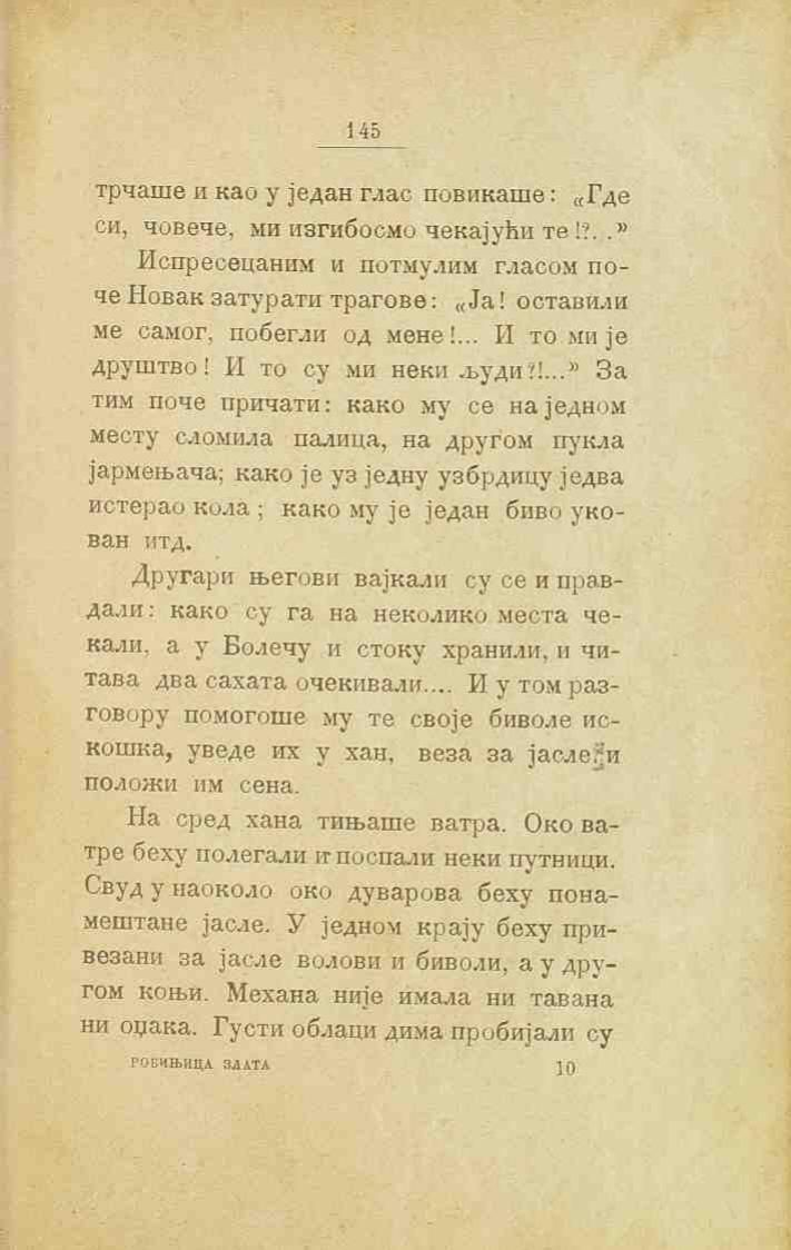 Испресецаним и потмулим гласом поче Новак затурати трагове: „Ја! оставили ме самог, побегли од мене!... И то мије друштво! И то су ми неки људи?!...“ За тим поче причати: како му се наједном месту сломила палица, на другом пукла јармењача; како је уз једну узбрдицу једва истерао кола; како му је један биво укован итд.