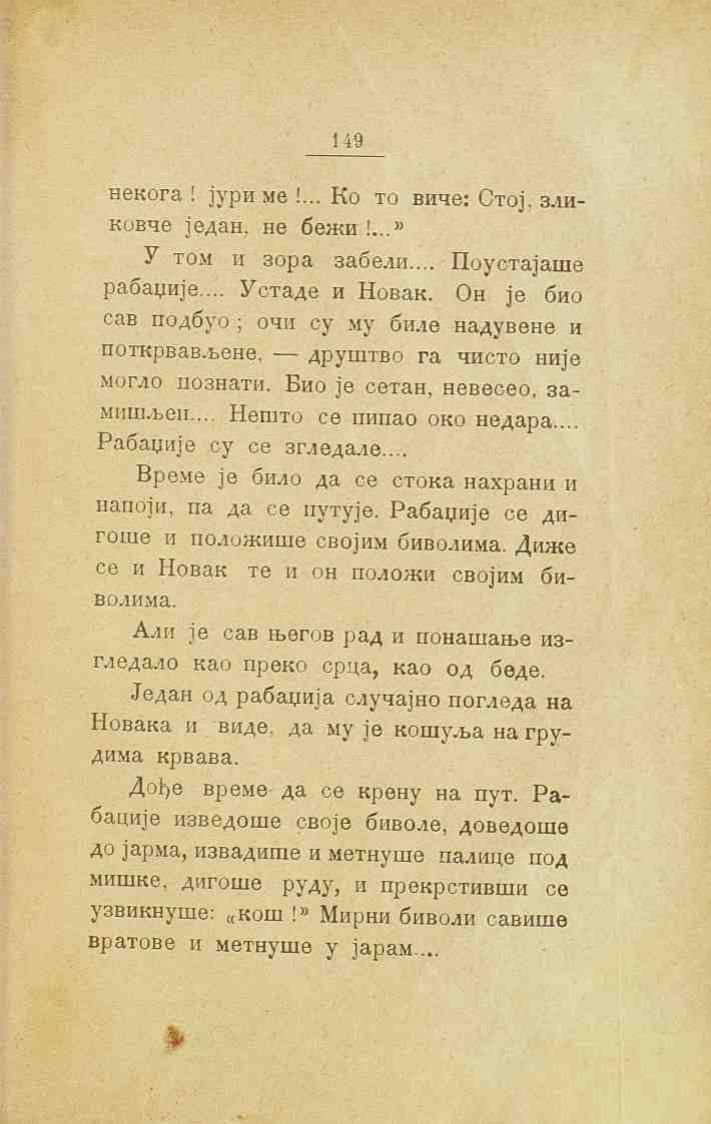 У том и зора забели.... Поустајаше рабаџије.... Устаде и Новак. Он је био сав подбуо; очи су му биле надувене и поткрвављене, — друштво га чисто није могло познати. Био је сетан, невесео, замишљен.... Нешто се пипао око недара.... Рабаџије су се згледале....