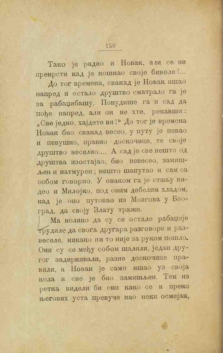 Ма колико да су се остале рабаџије трудиле да свога другара разговоре и развеселе, никако им то није за руком пошло. Они су се међу собом шалили, један другог задиркивали, разне доскочице правили, а Новак је само ишао уз своја кола и све је био замишљен. Тек из ретка видели би они како се и преко његових уста превуче као неки осмејак,