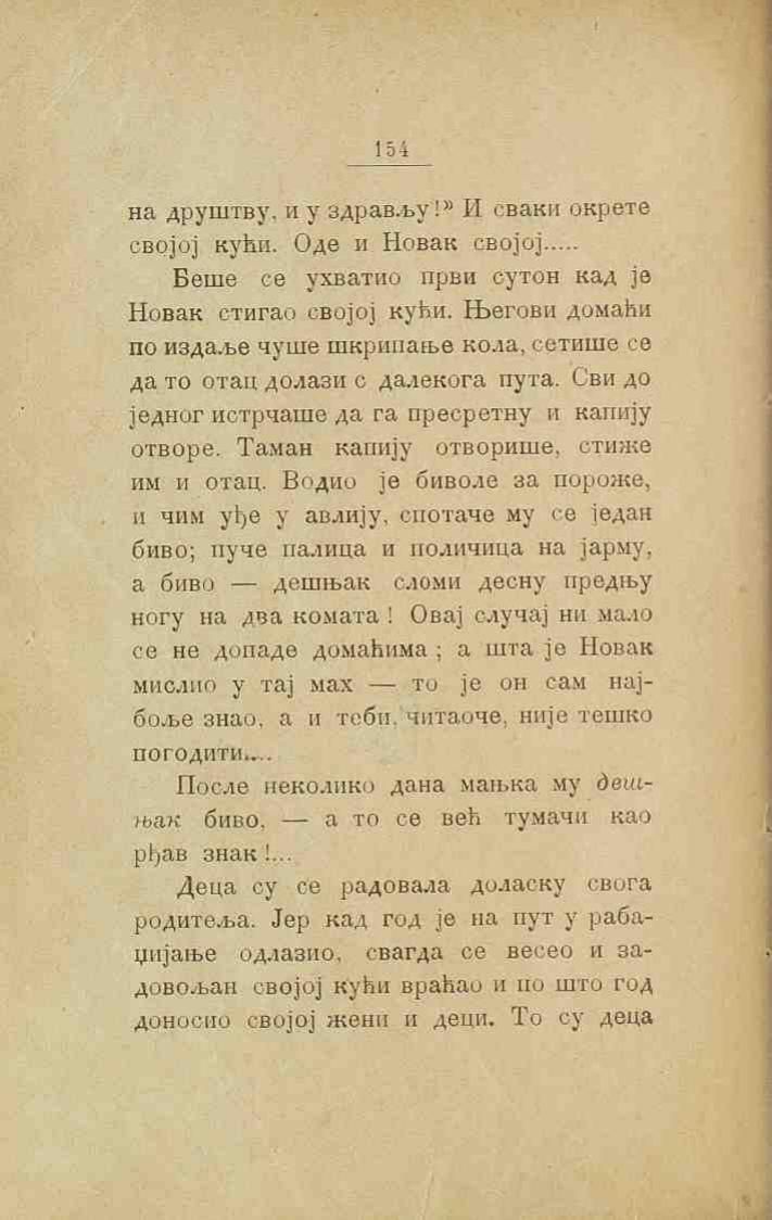 Беше се ухватио први сутон кад је Новак стигао својој кући. Његови домаћи по издаље чуше шкрипање кола, сетише се да то отац долази с далекога пута. Сви до једног истрчаше да га пресретну и капију отворе. Таман капију отворише, стиже им и отац. Водио је биволе за пороже, и чим уђе у авлију, спотаче му се један биво; пуче палица и поличица на јарму, а биво — дешњак сломи десну предњу ногу на два комата! Овај случај ни мало се не допаде домаћима; а шта је Новак мислио у тај мах — то је он сам најбоље знао, а и теби, читаоче, није тешко погодити.....
