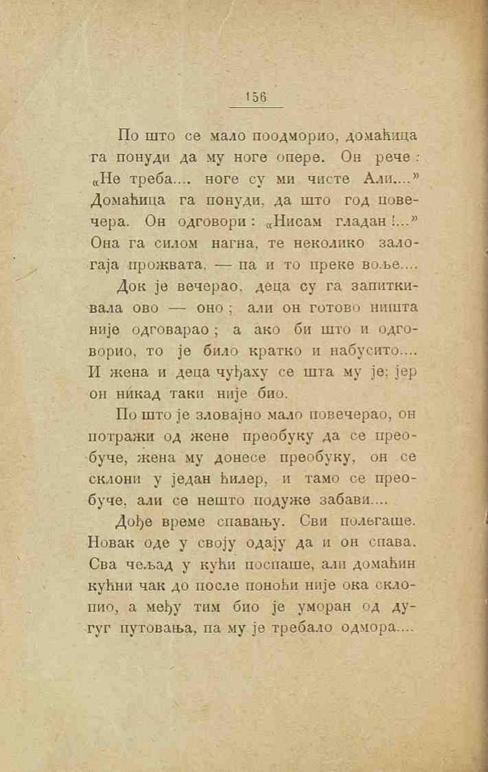 По што се мало поодморио, домаћица га понуди да му ноге опере. Он рече: „Не треба.... ноге су ми чисте. Али....“ Домаћица га понуди, да што год повечера. Он одговори: „Нисам гладан!...“ Она га силом нагна, те неколико залогаја прожвата, — па и то преке воље....