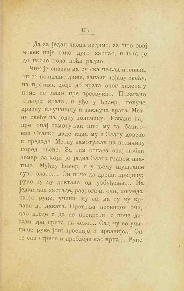 Чим је спазио да су сва чељад поспала, он се полагано диже, запали лојану свећу, на прстима дође до врата оног ћилера у коме се мало пре пресвукао. Полагано отвори врата, и уђе у ћилер, повуче дрвену кључаницу и закључа врата. Метну свећу на једну поличицу. Извади најпре онај замотуљак што му га баштован Станко даде када му и Злату доведе и предаде. Метну замотуљак на поличицу поред свеће. За тим отпаса онај кобни ћемер, за који је јадна Злата главом платила. Мућну ћемер, и у њему шушташе суво злато.... Он поче да дреши пређицу; руке су му дрктале од узбуђења,... На један мах застаде, разрогачи очи, погледа своје руке, учини му се, да су му крваве до лаката. Протрља песницом очи, као хтеде и да се прекрсти, и поче дизати три прста на чело.... Сад му се учинише руке још црвеније и крвавије.... Он се сав стресе и пребледе као крпа.... Руке