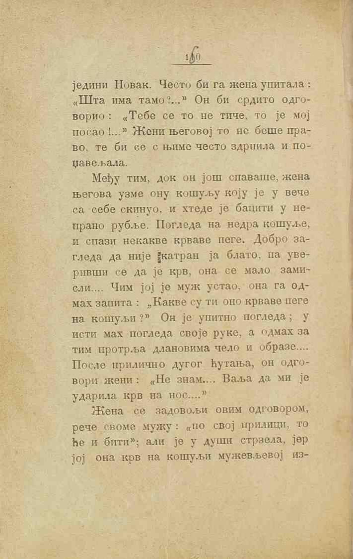 Међу тим, док он још спаваше, жена његова узме ону кошуљу коју је у вече са себе скинуо, и хтеде је бацити у непрано рубље. Погледа на недра кошуље, и спази некакве крваве пеге. Добро загледа да није катран ја блато, па уверивши се да је крв, она се мало замисли.... Чим јој је муж устао, она га одмах запита: „Какве су ти оно крваве пеге на кошуљи?“ Он је упитно погледа; у исти мах погледа своје руке, а одмах за тим протрља длановима чело и образе.... После прилично дугог ћутања, он одговори жени: „Не знам.... Ваља да ми је ударила крв на нос....“