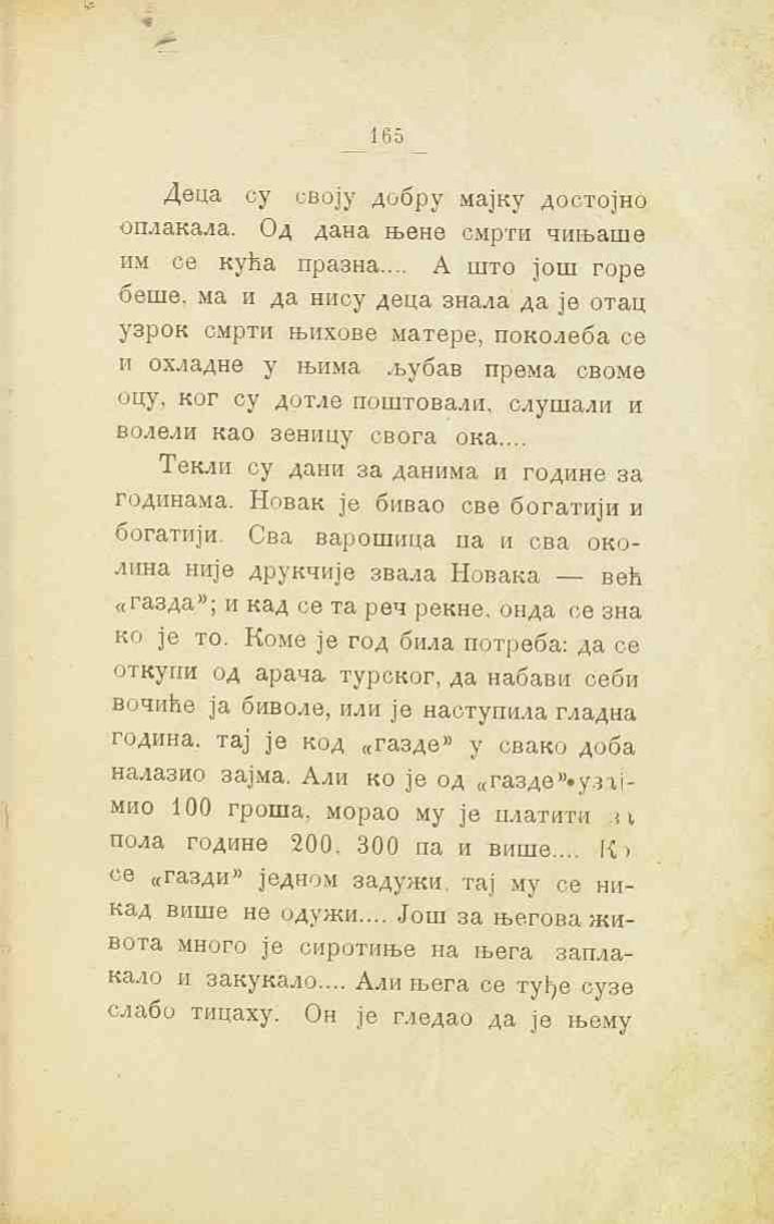 Текли су дани за данима и године за годинама. Новак је бивао све богатији и богатији. Сва варошица па и сва околина није друкчије звала Новака — већ „газда“; и кад се та реч рекне, онда се зна ко је то. Коме је год била потреба: да се откупи од арача турског, да набави себи вочиће ја биволе, или је наступила гладна година, тај је код „газде“ у свако доба налазио зајма. Али ко је од „газде“ узајмио 100 гроша, морао му је платити за пола године 200, 300 па и више.... Ко се „газди“ једном задужи, тај му се никад више не одужи.... Још за његова живота много је сиротиње на њега заплакало и закукало.... Али њега се туђе сузе слабо тицаху. Он је гледао да је њему