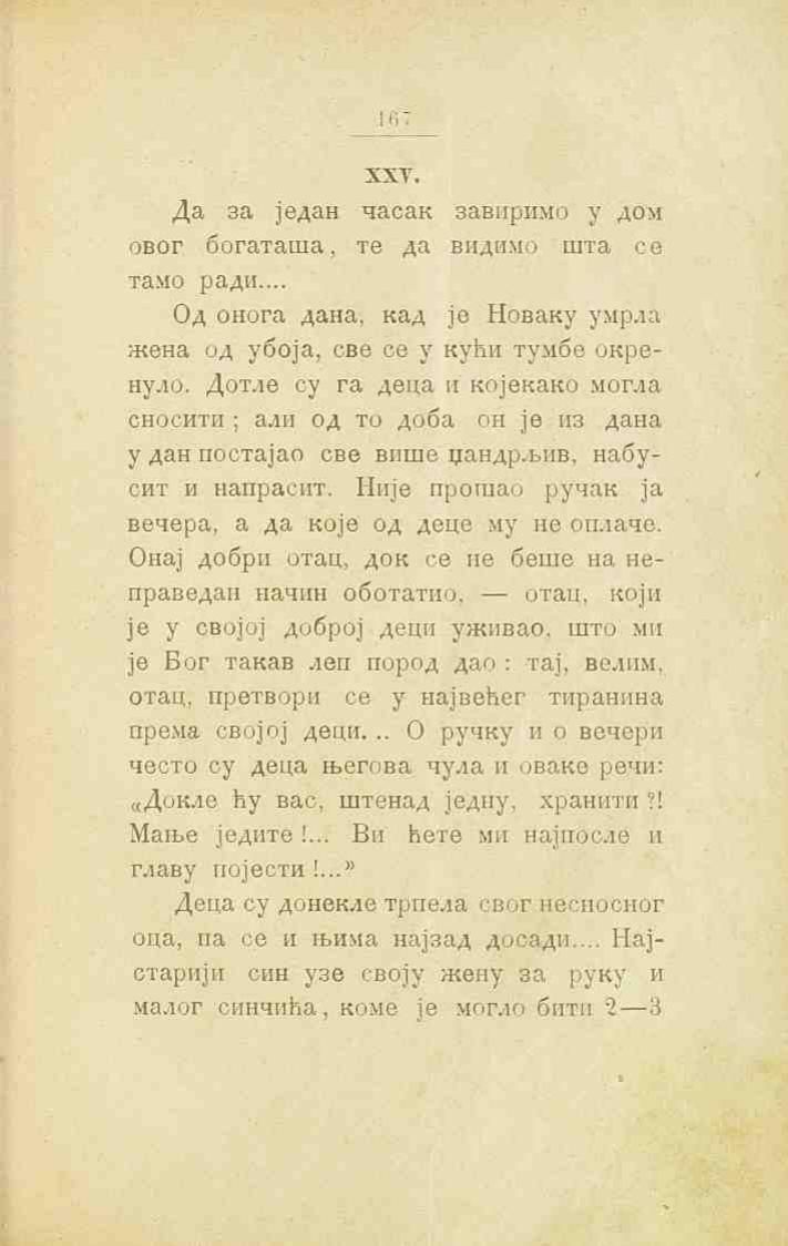 Од онога дана, кад је Новаку умрла жена од убоја, све се у кући тумбе окренуло. Дотле су га деца и којекако могла сносити; али од то доба он је из дана у дан постајао све више џандрљив, набусит и напрасит. Није прошао ручак ја вечера, а да које од деце му не оплаче. Онај добри отац, док се не беше на неправедан начин обогатио, — отац, који је у својој доброј деци уживао, што ми је Бог такав леп пород дао: тај, велим, отац, претвори се у највећег тиранина према својој деци.... О ручку и о вечери често су деца његова чула и оваке речи: „Докле ћу вас, штенад једну, хранити?! Мање једите!... Ви ћете ми најпосле и главу појести!...“