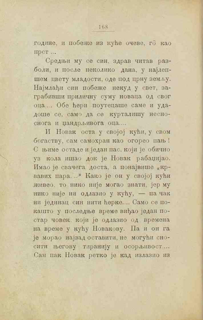 И Новак оста у својој кући, у свом богаству, сам самохран као огорео пањ! С њиме остаде и један пас, који је обично уз кола ишао док је Новак рабаџијао. Имао је свачега доста, а понајвише „крвавих пара....“ Како је он у својој кући живе, то нико није могао знати, јер му нико није ни одлазио у кућу, — па чак ни јединац син нити ћерке.... Само се покашто у последње време виђао један постар човек, који је одлазио од времена на време у кућу Новакову. Па и он га је морао најзад оставити, не могући сносити његову тиранију и осорљивост.... Сам пак Новак ретко је кад излазио из
