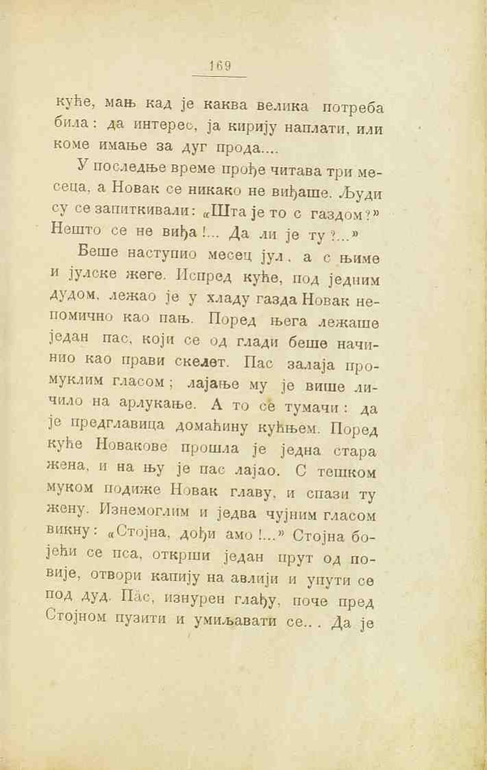 Беше наступио месец јул, а с њиме и јулске жеге. Испред куће, под једним дудом, лежао је у хладу газда Новак непомично као пањ. Поред њега лежаше један пас, који се од глади беше начинио као прави скелет. Пас залаја промуклим гласом; лајање му је више личило на арлукање. А то се тумачи: да је предглавица домаћину кућњем. Поред куће Новакове прошла је једна стара жена, и на њу је пас лајао. С тешком муком подиже Новак главу, и спази ту жену. Изнемоглим и једва чујним гласом викну: „Стојна, дођи амо!...“ Стојна бојећи се пса, открши један прут од повије, отвори капију на авлији и упути се под дуд. Пас, изнурен глађу, поче пред Стојном пузити и умиљавати се... Да је