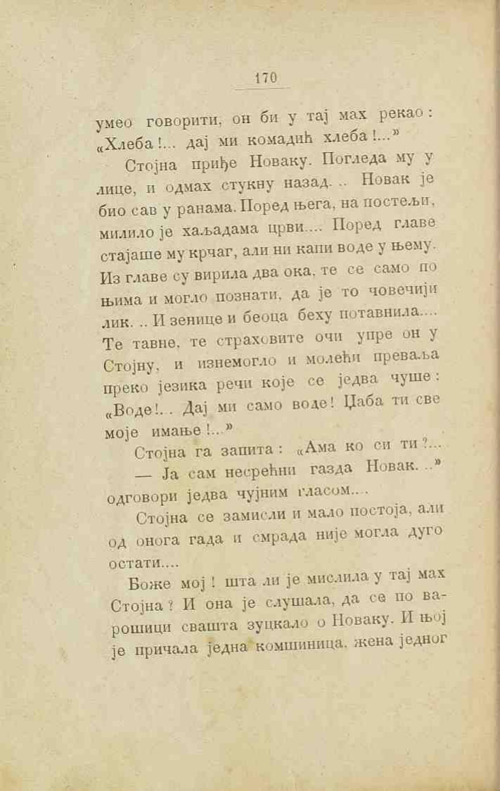 Стојна приђе Новаку. Погледа му у лице, и одмах стукну назад... Новак је био сав у ранама. Поред њега, на постељи, милило је хиљадама црви.... Поред главе стајаше му крчаг, али ни капи воде у њему. Из главе су вирила два ока, те се само по њима и могло познати, да је то човечији лик.... И зенице и беоца беху потавнила.... Те тавне, те страховите очи упре он у Стојну, и изнемогло и молећи преваља преко језика речи које се једва чуше: „Воде!... Дај ми само воде! Џаба ти све моје имање!...“
