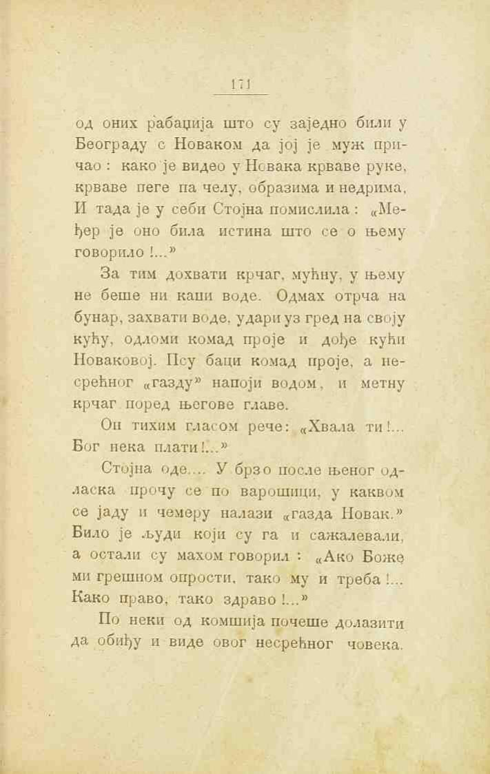 За тим дохвати крчаг, мућну, у њему не беше ни кани воде. Одмах отрча на бунар, захвати воде, удари уз гред на своју кућу, одломи комад проје и дође кући Новаковој. Псу баци комад проје, а несрећног „Газду“ напоји водом, и метну крчаг поред његове главе.