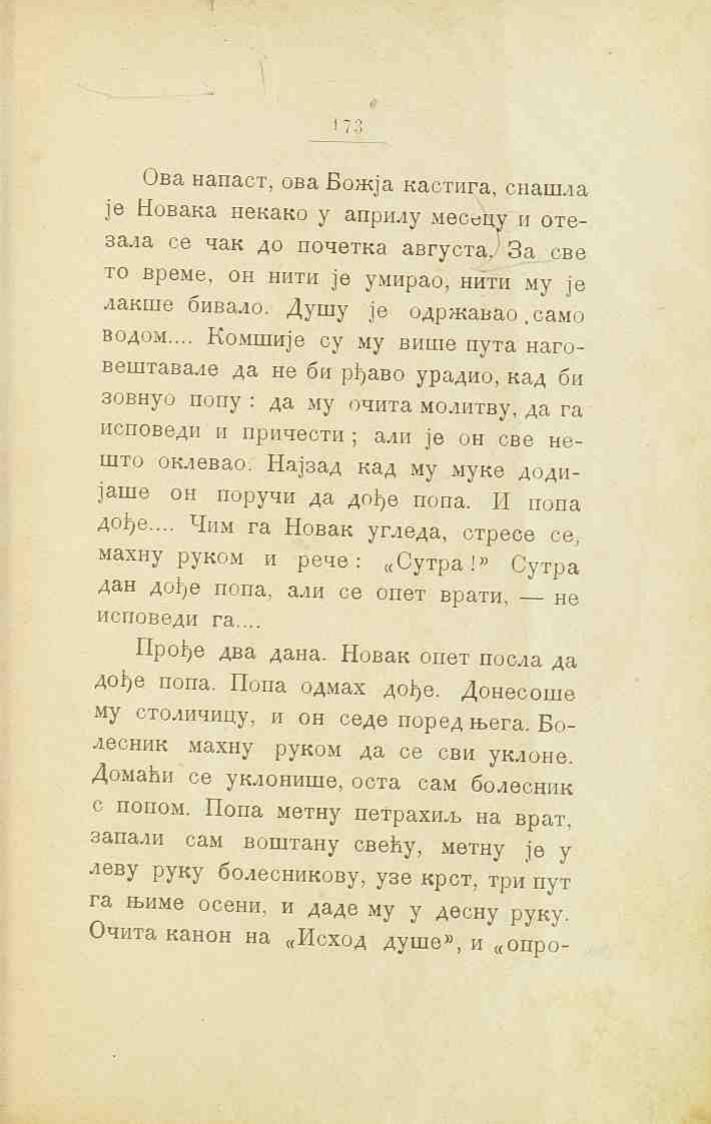 Ова напаст, ова Божја кастига, снашла је Новака некако у априлу месецу и отезала се чак до почетка августа. За све то време, он нити је умирао, нити му је лакше бивало. Душу је одржавао само водом.... Комшије су му више пута наговештавале да не би рђаво урадио, кад би зовнуо попу: да му очита молитву, да га исповеди и причести; али је он све нешто оклевао. Најзад кад му муке додијаше он поручи да дође попа. И попа дође.... Чим га Новак угледа, стресе се, махну руком и рече: „Сутра!“ Сутра дан дође попа, али се опет врати, не исповеди га....