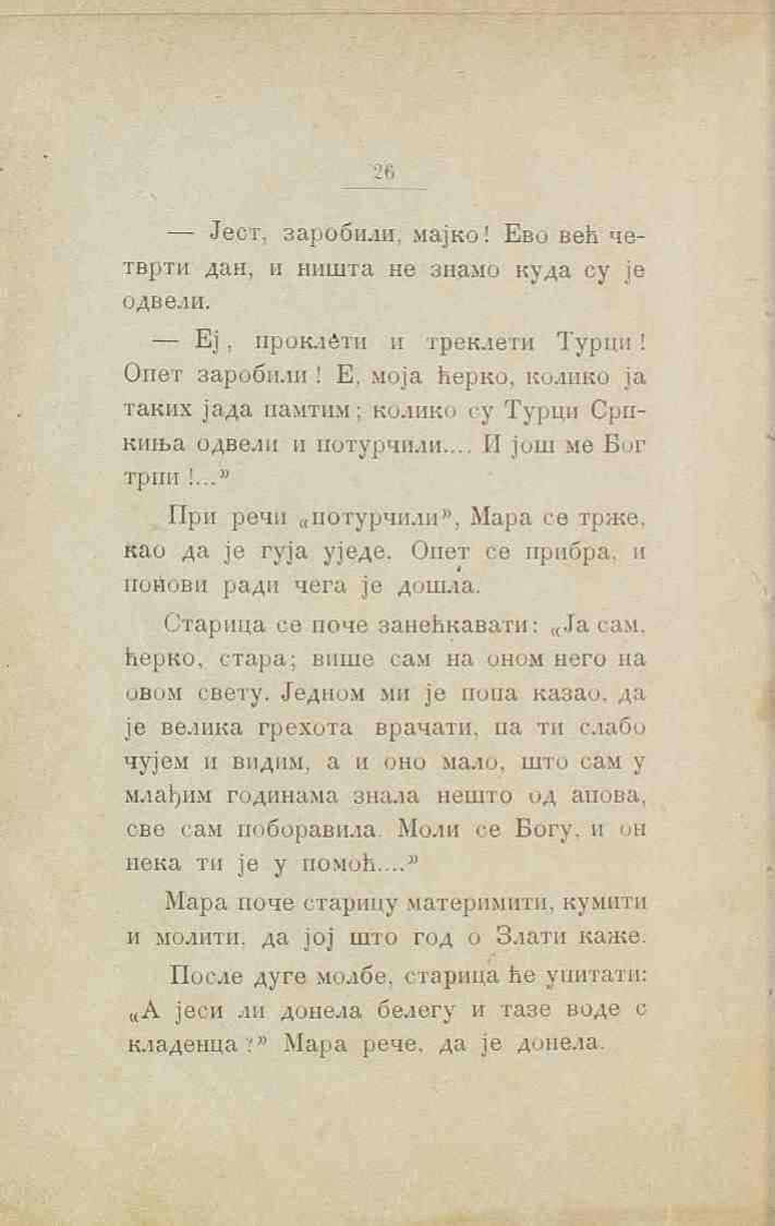 — Еј, проклети и треклети Турци! Опет заробили! Е, моја ћерко, колико ја таких јада памтим; колико су Турци Српкиња одвели и потурчили.... И још ме Бог трпи!...“
