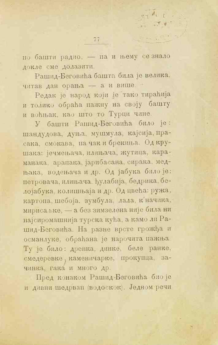 У башти Рашид-Беговића било је: шандудова, дуња, мушмула, кајсија, прасака, смокава, па чак и брекиња. Од крушака: јечмењача, илињача, жутица, караманака, арапака, јарибасана, сирака, медњака, водењача и др. Од јабука било је: петровача, илињача, ђулабија, бедрика, белојабука, колишњаја и др. Од цвећа: ружа, картона, шебоја, зумбула, лала, к’начика, мирисаљке, — а без зимзелена није била ни најсиромашнија турска кућа, а камо ли Рашид-Беговића. На разне врсте грожђа и османлуке, обраћана је нарочита пажња. Ту је било: дренка, динке, беле ранке, смедеревке, каменичарке, прокупца, зачинка, гака и много др.