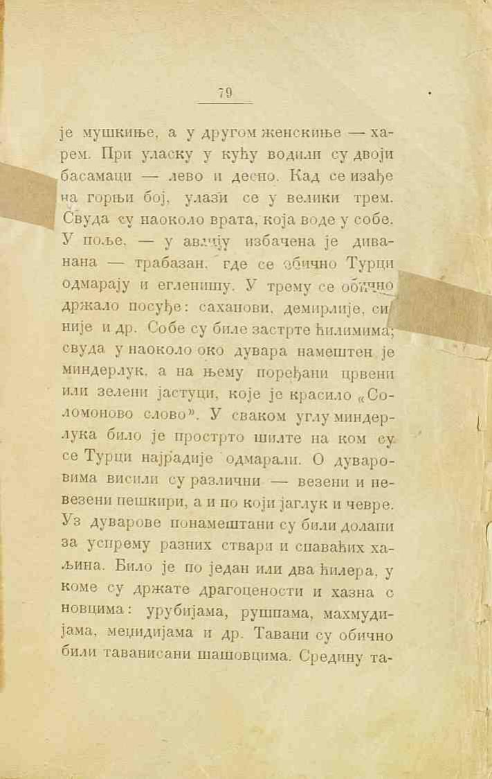 је мушкиње, а у другом женскињо — харем. При уласку у кућу водили су двоји басамаци — лево и десно. Кад се изађе на горњи бој, улази се у велики трем. Свуда су наоколо врата, која воде у собе. У поље, — у авлију избачена је диванана - трабазан, где се обично Турци одмарају и егленишу. У трему се обично држало посуђе: саханови. демирлије, синије и др. Собе су биле застрте ћилимима; свуда у наоколо око дувара намештен је миндерлук, а на њему поређани црвени или зелени јастуци, које је красило „Соломоново слово“. У сваком углу миндерлука било је прострта шилте на ком су се Турци најрадије одмарали. О дуваровима висили су различни — везени и невезени пешкири, а и по који јаглук и чевре. Уз дуварове понамештани су били долапи за успрему разних ствари и спаваћих хаљина. Било је по једак или два ћилера, у коме су држате драгоцености и хазна с новцима: урубијама, рушпама, махмудијама, меџидијама и др. Тавани су обично били таванисани шашовцима. Средину тавана