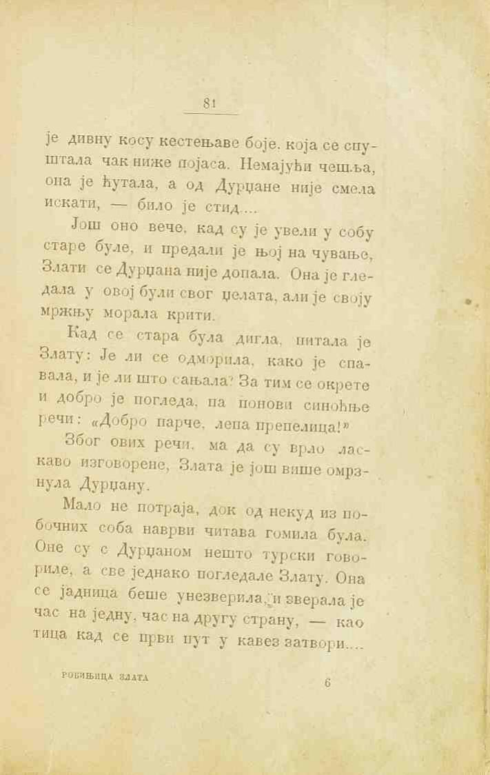 Мало не потраја, док од некуд из побочних соба наврви читава гомила була. Оне су с Дурџаном нешто турски говориле, а све једнако погледале Злату. Она се јадница беше унезверила, и зверала је час на једну, час на другу страну, — као тица кад се први пут у кавез затвори.....
