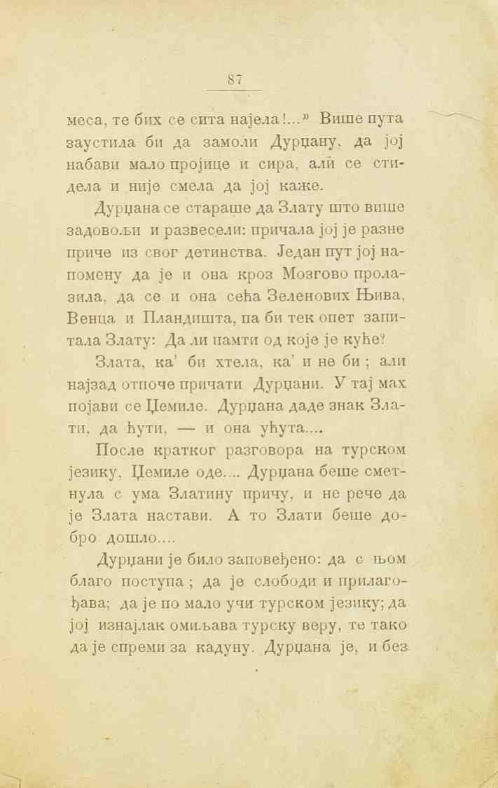 Злата, ка’ би хтела, ка’ и не би; али најзад отпоче причати Дурџани. У тај мах појави се Џемиле. Дурџана даде знак Злати, да ћути, — и она ућута....