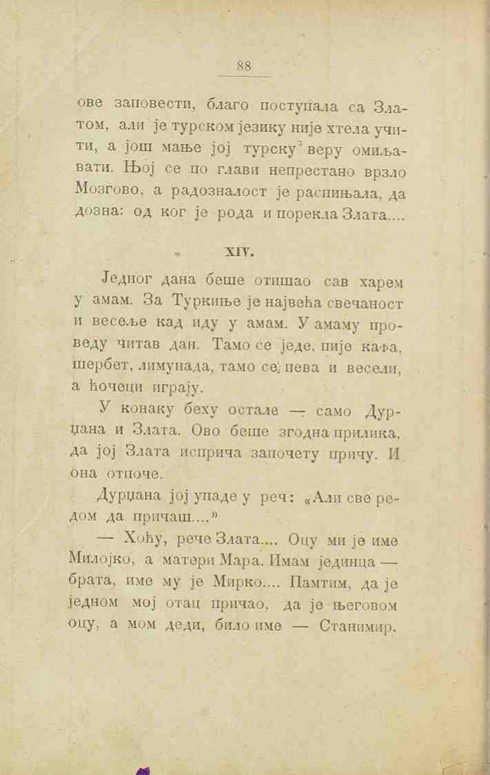 — Хоћу, рече Злата.... Оцу ми је име Милојко, а матери Мара. Имам јединца — брата, име му је Мирко.... Памтим, да је једном мој отац причао, да је његовом оцу, а мом деди, било име — Станимир.