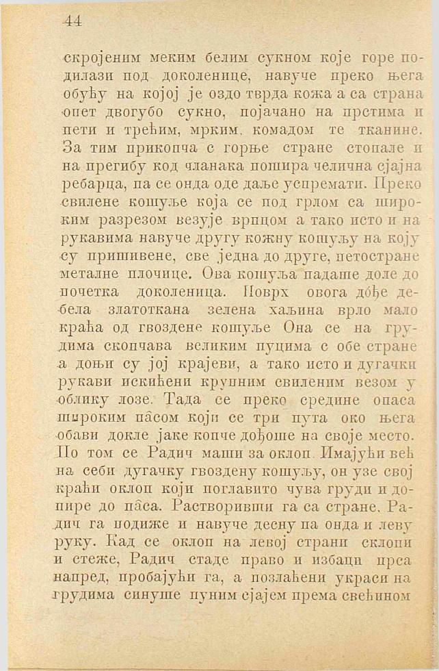 скројеним меким белим сукном које горе подилази под доколенице, навуче преко њега обућу на којој је оздо тврда кожа а са страна опет двогубо сукно, појачано на прстима и пети и трећим, мрким, комадом те тканине. За тим прикопча с горње стране стопале и на прегибу код чланака пошира челична сјајна ребарца, па се онда оде даље успремати. Преко свилене кошуље која се под грлом са широким разрезом везује врпцом а тако исто и на рукавима навуче другу кожну кошуљу на коју су пришивене, све једна до друге, петостране металне плочице. Ова кошуља падаше доле до почетка доколеница. Поврх овога дође дебела златоткана зелена хаљина врло мало краћа од гвоздене кошуље. Она се на грудима скопчава великим пуцима с обе стране а доњи су јој крајеви, а тако исто и дугачки рукави искићени крупним свиленим везом у облику лозе. Тада се преко средине опаса широким пасом који се три пута око њега обави докле јаке копче дођоше на своје место. По том се Радич маши за оклоп. Имајући већ на себи дугачку гвоздену кошуљу, он узе свој краћи оклоп који поглавито чува груди и допире до паса. Растворивши га са стране, Радич га подиже и навуче десну па онда и леву руку. Кад се оклоп на левој страни склопи и стеже, Радич стаде право и избаци прса напред, пробајући га, а позлаћени украси на грудима синуше пуним сјајем према свећином