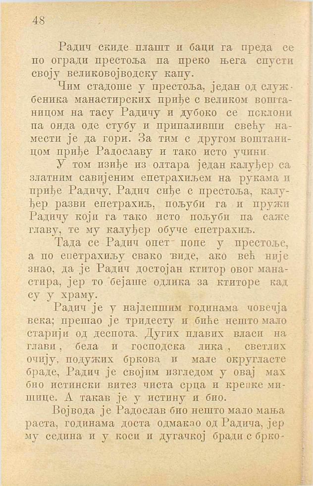 Тада се Радич опет попе у престоље, а по епетрахиљу свако виде, ако већ није знао, да је Радич достојан ктитор овог манастира, јер то бејаше одлика за ктиторе кад су у храму.