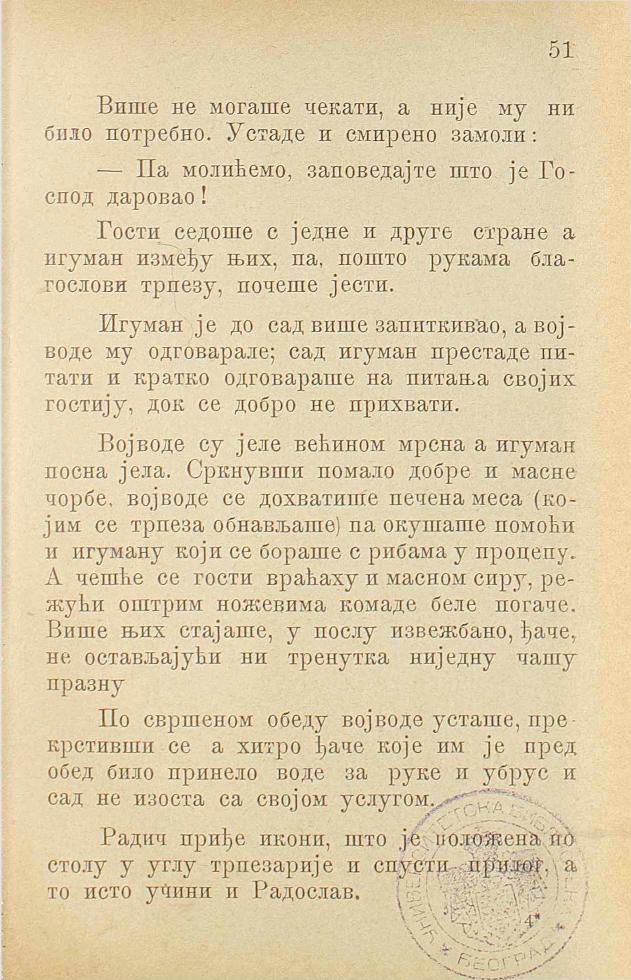 Војводе су јеле већином мрсна а игуман посна јела. Сркнувши помало добре и масне чорбе, војводе се дохватише печена меса (којим се трпеза обнављаше) па окушаше помоћи и игуману који се бораше с рибама у процепу. А чешће се гости враћаху и масном сиру, режући оштрим ножевима комаде беле погаче. Више њих стајаше, у послу извежбано, ђаче, не остављајући ни тренутка ниједну чашу празну.