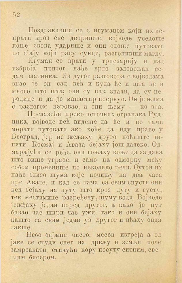 Прелазећи преко источних огранака Рудника, војводе већ видеше да ће и по тами морати путовати ако хоће да иду право у Београд, јер не жељаху друго ноћиште чинити. Космај и Авала бејаху још далеко. Одмарајући се ређе, они гоњаху коње да за дана што више уграбе, и само на одморку међу собом променише по неколико речи. Сутон их нађе близо шума које почињу на два часа пре Авале, и кад се тама са свим спусти они већ бејаху на путу што кроз дугу и густу, тек местимице разређену, шуму води. Војводе јежђаху један поред другог, а како је пут бивао час шири час ужи, тако и они бејаху кашто са свим један уз другог и иђаху онда лакше.