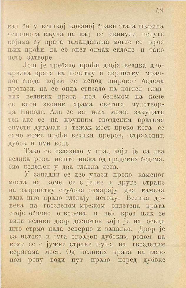 Још је требало проћи двоја велика двокрилна врата на почетку и свршетку мрачног свода којим се испод широког бедема пролази, па се онда стизало на поглед главних великих врата под бедемом на коме се виси звоник храма светога чудотворца Николе. Али се на њих може закуцати тек ако се на крупним гвозденим вратима спусти дугачак и тежак мост преко кога се само може проћи велики преров, страховит, дубок и пун воде.
