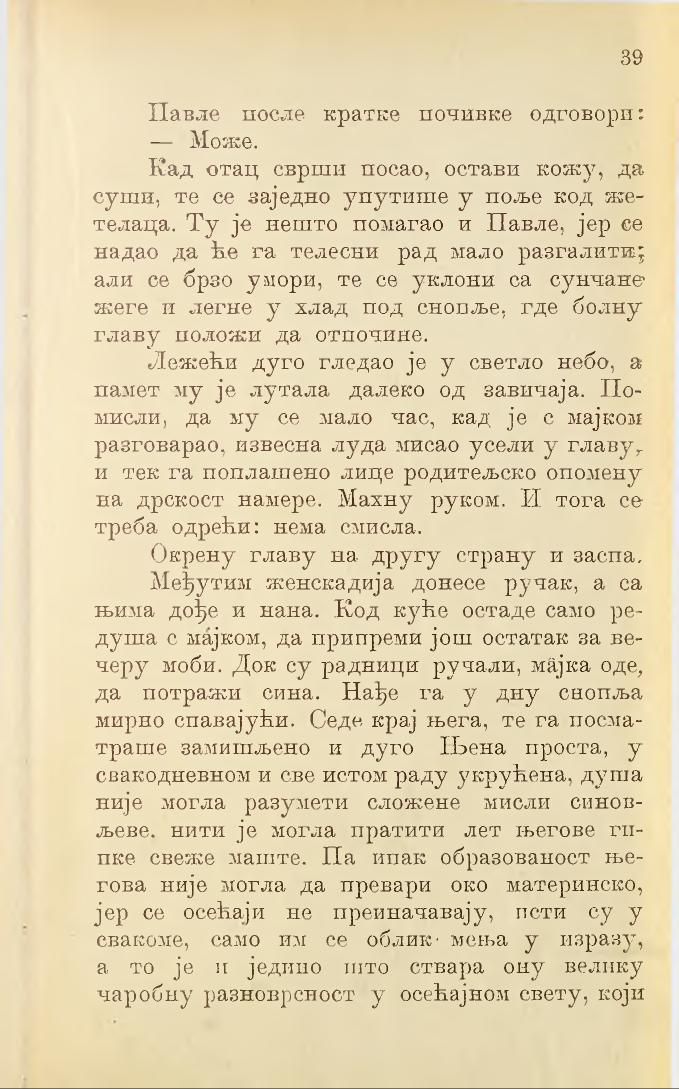 Међутим женскадија донесе ручак, а са њима дође и нана. Код куће остаде само редуша с мајком, да припреми још остатак за вечеру моби. Док су радници ручали, мајка оде, да потражи сина. Нађе га у дну снопља мирно спавајући. Седе крај њега, те га посматраше замишљено и дуго. Њена проста, у свакодневном и све истом раду укрућена, душа није могла разумети сложене мисли синовљеве, нити је могла пратити лет његове гипке свеже маште. Па ипак образованост његова није могла да превари око материнско, јер се осећаји не преиначавају, исти су у свакоме, само им се облик мења у изразу, а то је и једино што ствара ону велику чаробну разноврсност у осећајном свету, који