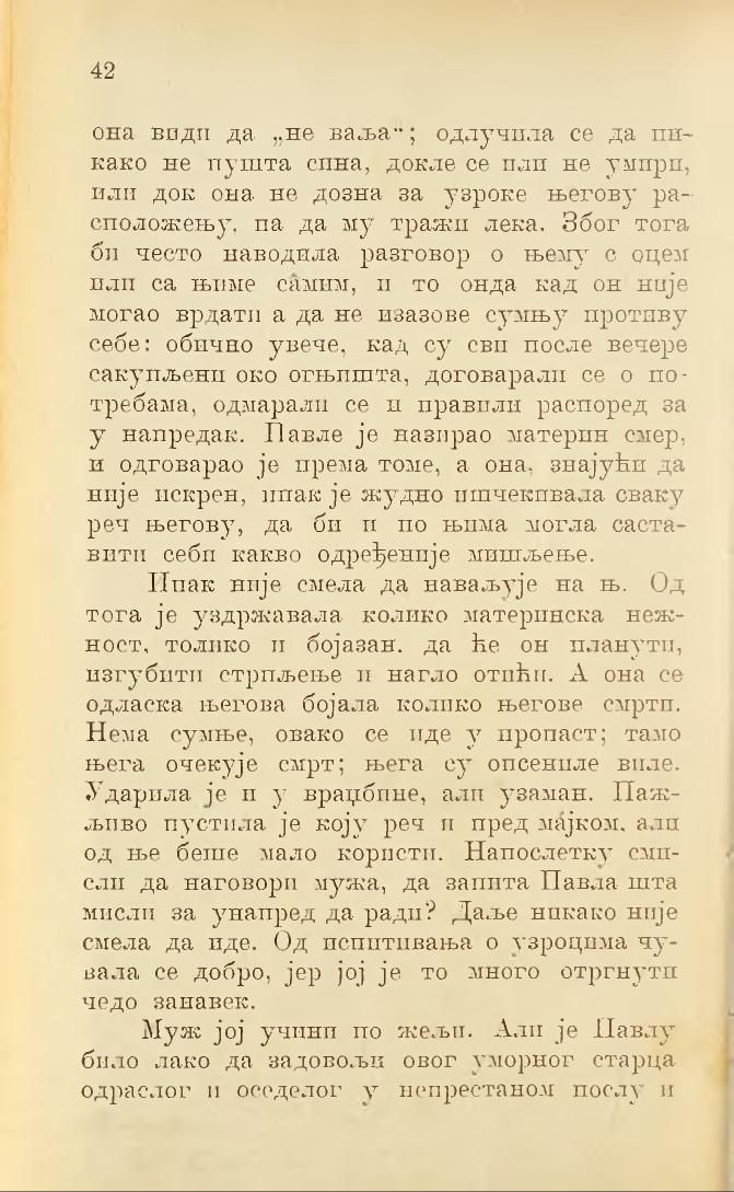 Ипак није смела да наваљује на њ. Од тога је уздржавала колико материнска нежност, толико и бојазан, да ће он планути, изгубити стрпљење и нагло отићи. А она се одласка његова бојала колико његове смрти. Нема сумње, овако се иде у пропаст; тамо њега очекује смрт; њега су опсениле виле. Ударила је и у враџбине, али узаман. Пажљиво пустила је коју реч и пред мајком, али од ње беше мало користи. Напослетку смисли да наговори мужа, да запита Павла шта мисли за унапред да ради? Даље никако није смела да иде. Од испитивања о узроцима чувала се добро, јер јој је то много отргнути чедо занавек.