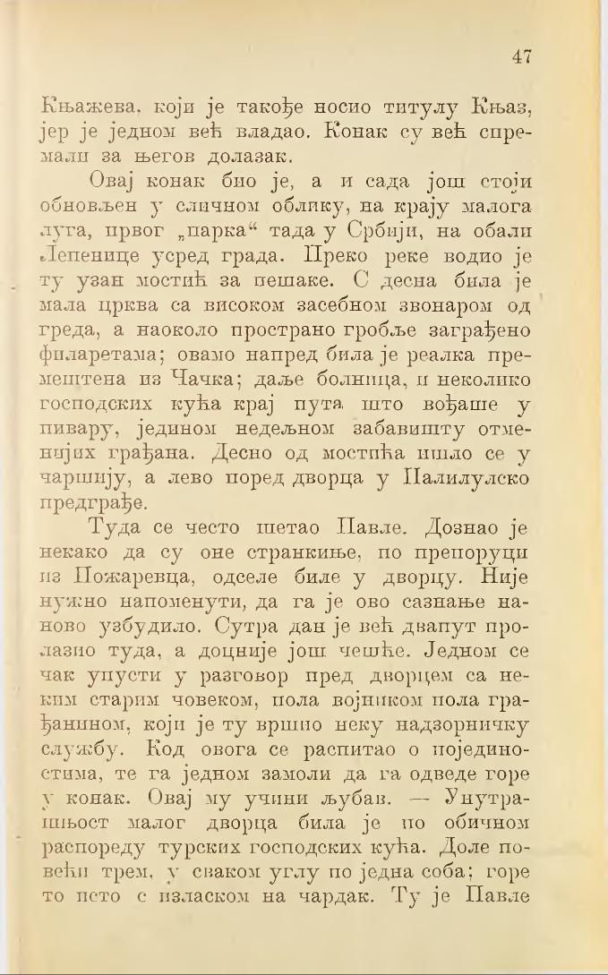 Туда се често шетао Павле. Дознао је некако да су оне странкиње, по препоруци из Пожаревца, одселе биле у дворцу. Није нужно напоменути, да га је ово сазнање наново узбудило. Сутра дан је већ двапут пролазио туда, а доцније још чешће. Једном се чак упусти у разговор пред дворцем са неким старим човеком, пола војником пола грађанином, који је ту вршио неку надзорничку службу. Код овога се распитао о појединостима, те га једном замоли да га одведе горе у конак. Овај му учини љубав. — Унутрашњост малог дворца била је по обичном распореду турских господских кућа. Доле повећи трем, у сваком углу по једна соба; горе то исто с изласком на чардак. Ту је Павле