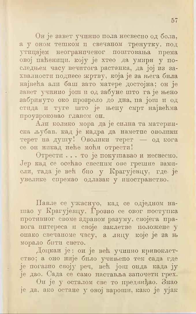 Он је завет учинио пола несвесно од бола, а у оном тешком и свечаном тренутку, под утицајем неограниченог поштовања према овој паћеници, коју је хтео да умири у последњем часу вечитога растанка, да јој из захвалности поднесе жртву, која је за њега била највећа али баш зато матере достојна; он је завет учинио још и од забуне што га је њено забринуто око прозрело до дна, па још и од стида и туге што је њену смрт највећма проузроковао главом он.