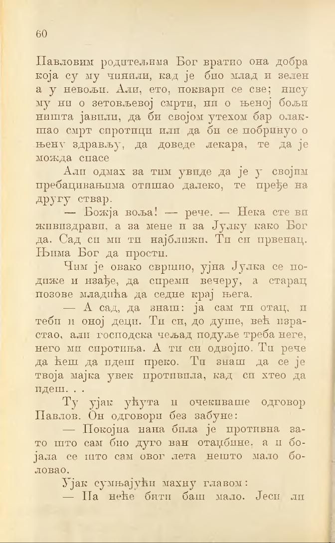 — Божја воља! — рече. — Нека сте ви живиздрави, а за мене и за Јулку како Бог да. Сад си ми ти најближи. Ти си првенац. Њима Бог да прости.