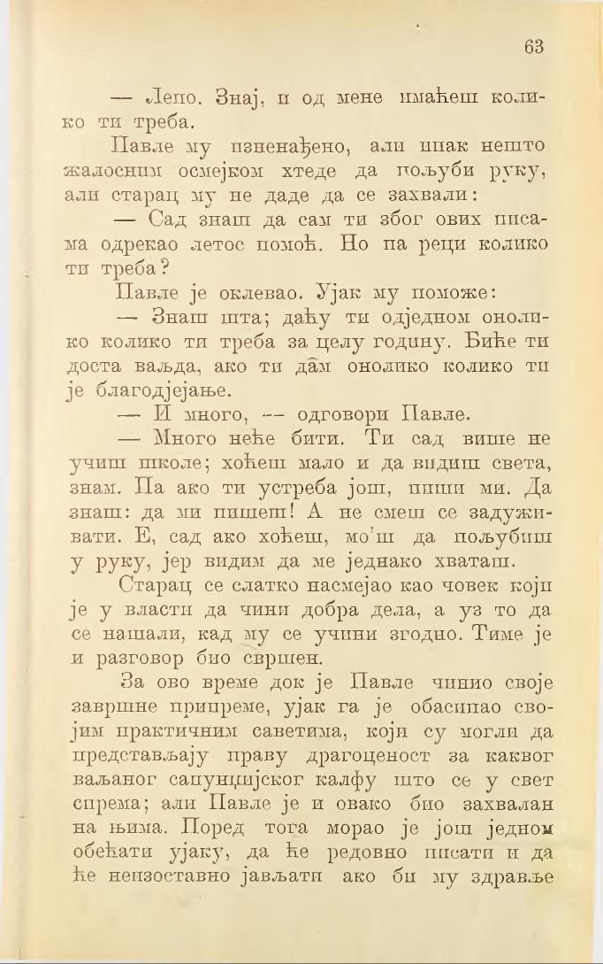 — Много неће бити. Ти сад више не учиш школе; хоћеш мало и да видиш света, знам. Па ако ти устреба још, пиши ми. Да знаш: да ми пишеш! А не смеш се задуживати. Е, сад ако хоћеш, мо’ш да пољубиш у руку, јер видим да ме једнако хваташ.