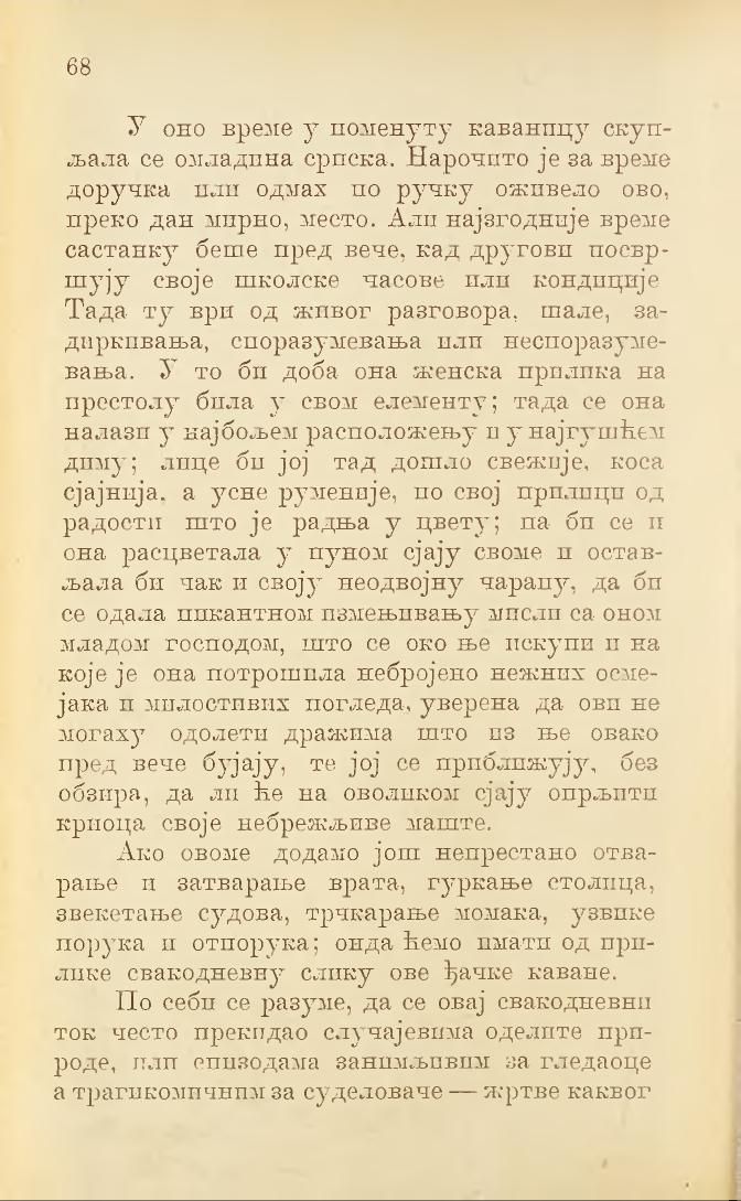 У оно време у поменуту каваницу скупљала се омладина српска. Нарочито је за време доручка или одмах по ручку оживело ово, преко дан мирно, место. Али најзгодније време састанку беше пред вече, кад другови посвршују своје школске часове или кондиције. Тада ту ври од живог разговора, шале, задиркивања, споразумевања или неспоразумевања. У то би доба она женска прилика на престолу била у свом елементу; тада се она налази у најбољем расположењу и у најгушћем диму; лице би јој тад дошло свежије, коса сјајнија, а усне руменије, по свој прилици од радости што је радња у цвету; па би се и она расцветала у пуном сјају своме и остављала би чак и своју неодвојну чарапу, да би се одала пикантном измењивању мисли са оном младом господом, што се око ње искупи и на које је она потрошила небројено нежних осмејака и милостивих погледа, уверена да ови не могаху одолети дражима што из ње овако пред вече бујају, те јој се приближују, без обзира, да ли ће на оволиком сјају опрљити криоца своје небрежљиве маште.