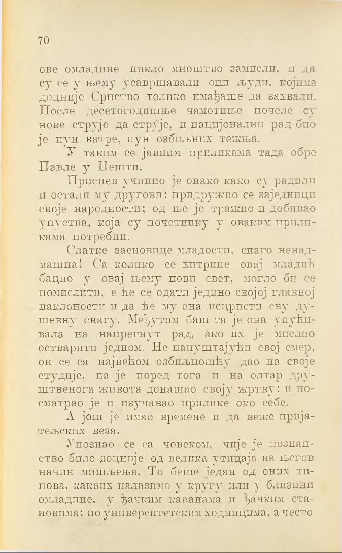 Слатке засновице младости, снаго ненадмашна! Са колико се хитрине овај младић бацио у овај њему нови свет, могло би се помислити, е ће се одати једино својој главној наклоности и да ће му она исцрпсти сву душевну снагу. Међутим баш га је она упућивала на напрегнут рад, ако их је мислио остварити једном. Не напуштајући свој смер, он се са највећом озбиљношћу дао на своје студије, па је поред тога и на олтар друштвенога живота донашао своју жртву: и посматрао је и изучавао прилике око себе.