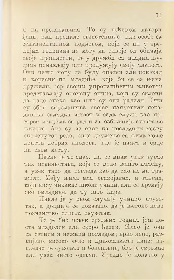 Павле је то знао, па се ипак увек чувао тих познанстава, која се врло вешто намећу, а увек тако да изгледа као да смо их ми тражили. Међу њима има свакојаких, и таквих, који нису никакве школе учили, али се врзмају око омладине, да ту што ћаре.